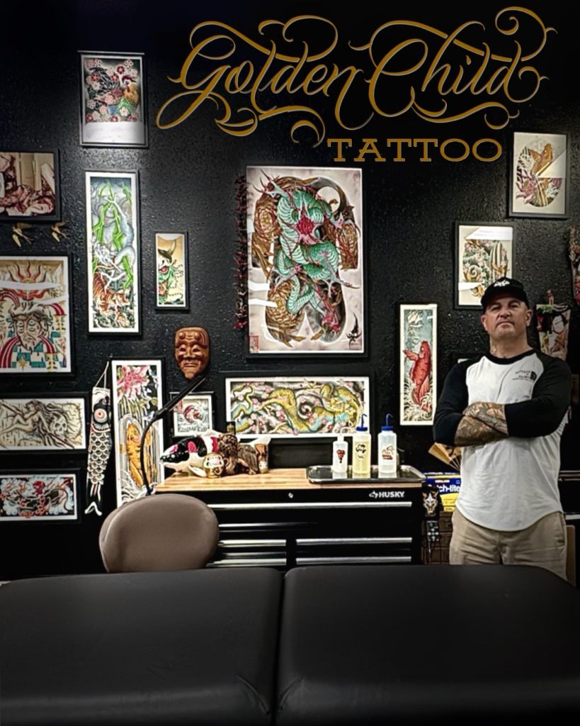 These days when I’m not at Golden Child, you’ll find me guest spotting, from Maui and Kauai, up through Northern California, Chicago, the Southwest. I also paint large-scale watercolor and ink art inspired by the Japanese traditions I study. It keeps my eye sharp and my hand steady. I build custom tattoo machines when I need to problem-solve with my hands.