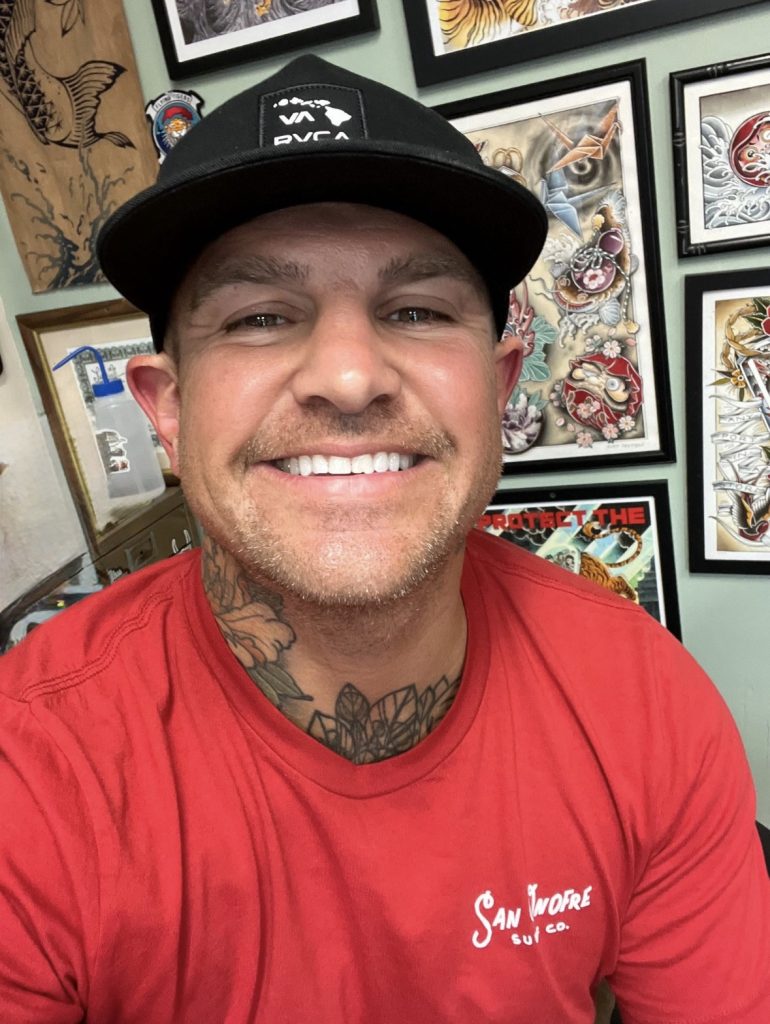 I approach every session calmly and collaboratively. Whether we’re starting fresh or fixing a piece that needs new life, I want to nail exactly what you’re going for. Outside the shop, I’m in the mountains snowboarding, fishing, camping and hiking with my dog Bruno. Living ant the beach here in San Diego for decades I also love to surf, skateboard and enjoy the water as much as possible. Nature reminds me that everything ages with character, and I bring that respect into every tattoo I do.