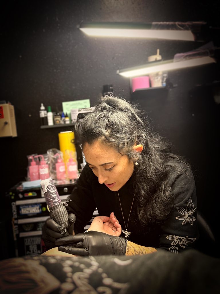 Crisp lines have always been my love language. Growing up in Valley Center, I’d draw lines on everything from notebook margins to bicycle helmets long before I touched a tattoo machine. Two years ago I swapped pencils for a tattoo machine starting my career at the Tattoo Temple in Hillcrest, refining a style that mixes feather-thin precision with bold, story-driven imagery. Today I focus on custom linework, delicate florals, black-and-grey botanicals, and playful flash inspired by 90s zines and folk-art posters.